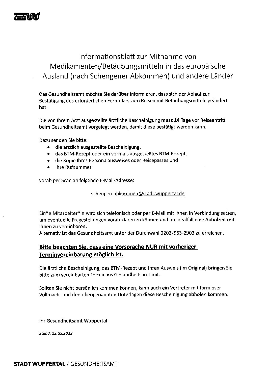 Entsprechend dem aktuellen Informationsblatt zur Mitnahme von Betäubungsmitteln in das europäische Ausland hat die Stadt Wuppertal ein neuer Informationsblatt veröffentlicht, auf der die Voraussetzungen für die Ausstellung einer entsprechenden Mitführungserlaubnis zum Reisen mit Betäubungsmitteln geändert hat!